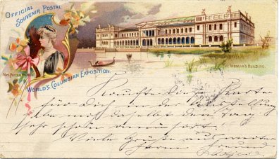 The Official Souvenir Postal Card is on the back of the Grant postal card issue of 1891. These souvenir cards were predecessors of picture postcards. The Woman's Building is illustrated on the card which was mailed to Hamburg Germany in July 1893. The one cent stamp of the Columbian Exposition issue of 1893 has been added to makeup the international postal card rate.