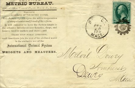 envelope was mailed to Melvil Dewey in Amherst, MA in 1876. The mystery here is that Dewey
